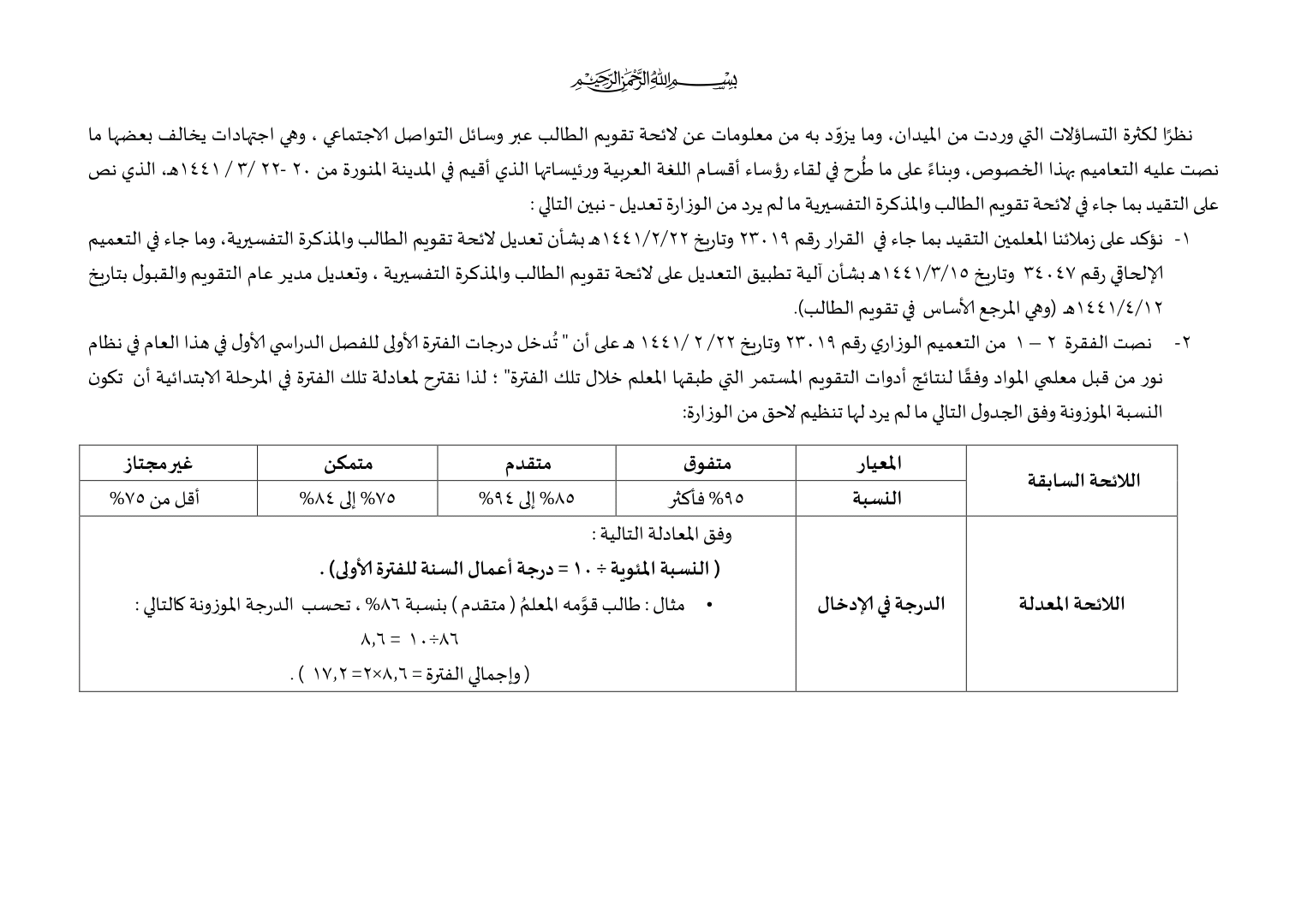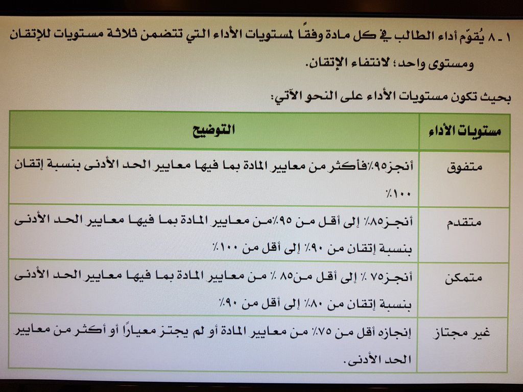 متفوق متقدم متمكن غير مجتاز. ابغى شرح وافي لألية التقويم الجديدة متفوق متقدم متمكن غير مجتاز في حاله اتقن الطالب كل مهارات الحد الادنى ولم يتقن مهارة من الغير ادنى هل فعلا يرسب الطالب ام ماذا. السلام عليكم ورحمة الله حول التعديلات على التقويم الجديدة سأقول باختصار أن مستويات الإتقان متفوق متقدم متمكن غير مجتاز هي لمجموع معايير المادة وليس المعيار الواحد ونظام نور يتكفل باستخراج هذه النسبة وفق ما. تغيير آلية تقويم الطلاب في المرحلة الابتدائية إلى متفوق متقدم متمكن غير مجتاز بدلا من. الصف المعيار المهارة المهارة المهارة المهارة مستوى الطالبة اسم الطالبة متفوق متقدم متمكن غير مجتاز متفوق متقدم متمكن غير مجتاز متفوق متقدم متمكن غير مجتاز متفوق متقدم متمكن غير مجتاز متفوق متقدم متمكن غير مجتاز.